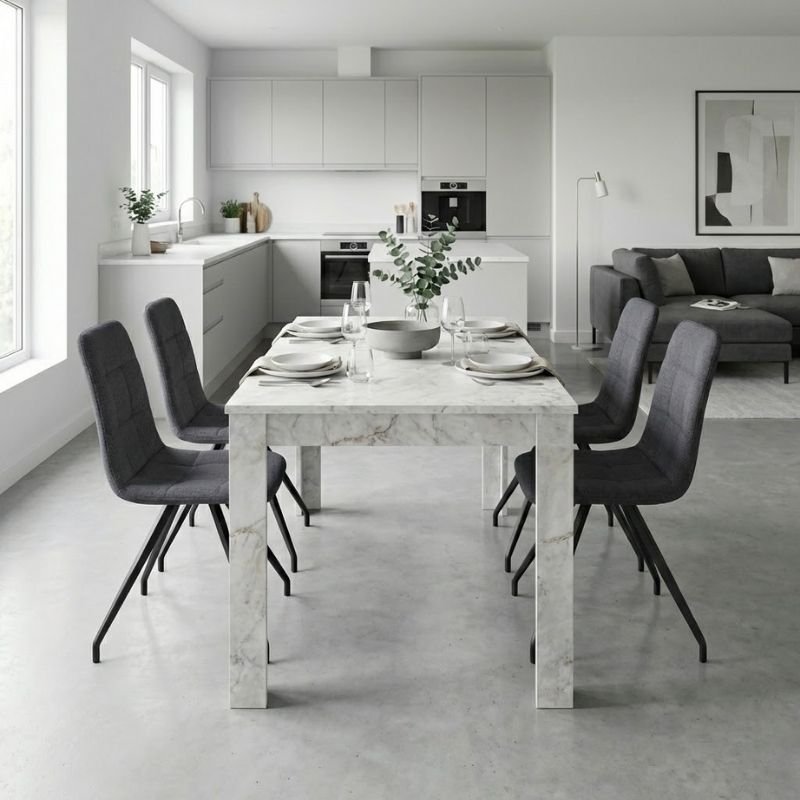 Η τραπεζαρία Darlen – Bianca θα προσθέσει μοντέρνα κομψότητα και άνεση σε κάθε χώρο. Το απαλό ύφασμα της καρέκλας προσφέρει αισθητική άνεσης, ενώ τα στιβαρά, μαύρα μεταλλικά πόδια προσδίδουν μοντέρνα και σταθερή δομή. Είναι ιδανική για την τραπεζαρία ενός μοντέρνου σπιτιού, αλλά και για επαγγελματικούς χώρους όπως καφέ, εστιατόρια ή AirBnB – όπου η λεπτομέρεια και η αισθητική κάνουν τη διαφορά.