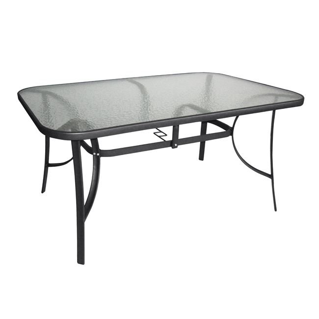 Ένα τραπέζι μεταλλικό εξωτερικού χώρου σε χρώμα γκρι-ανθρακί, με ενσωματωμένο τζάμι ασφάλειας (secure).