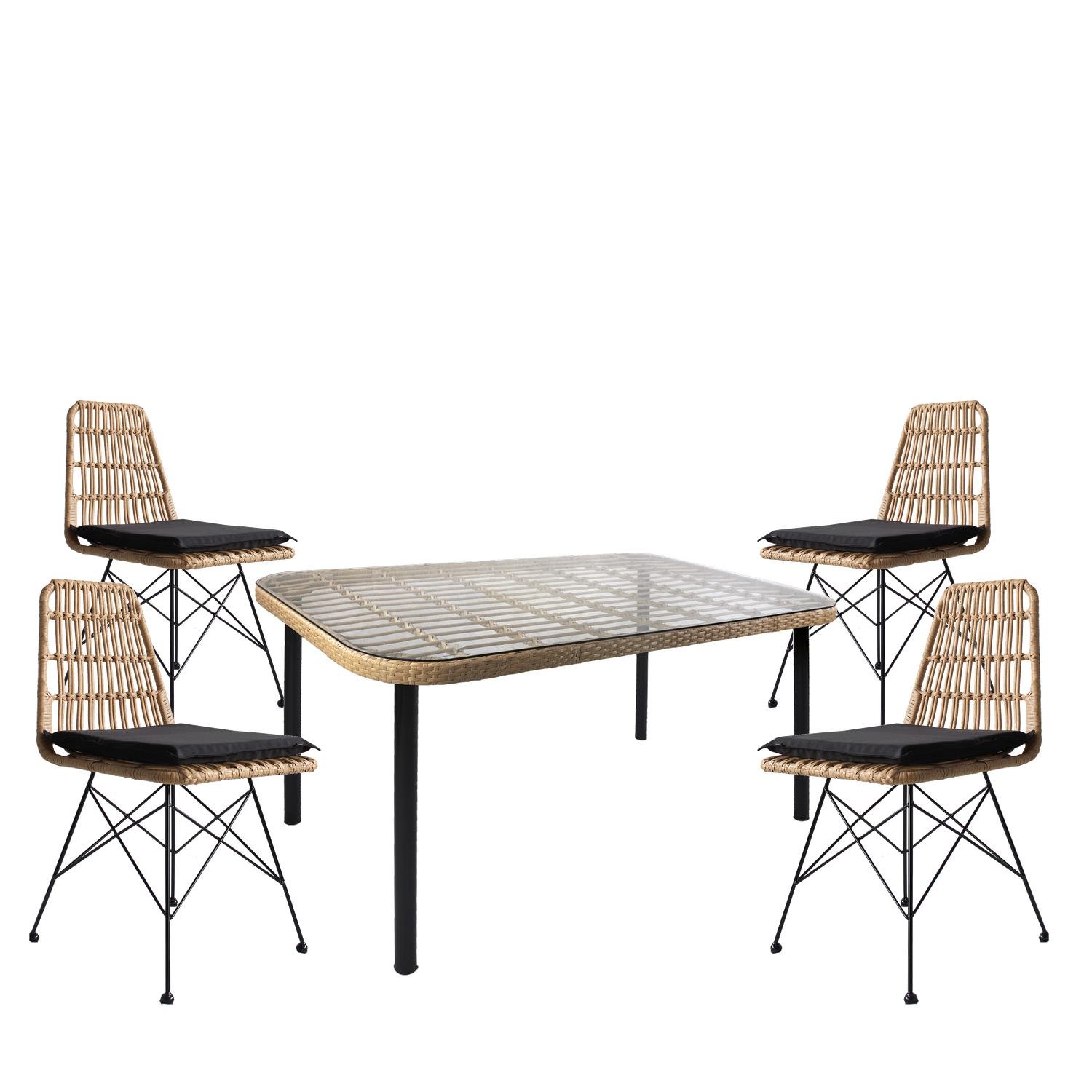Σετ τραπεζαρία κήπου AMPLAS φυσικό/μαύρο μέταλλο/rattan/γυαλί με 4 καρέκλες.