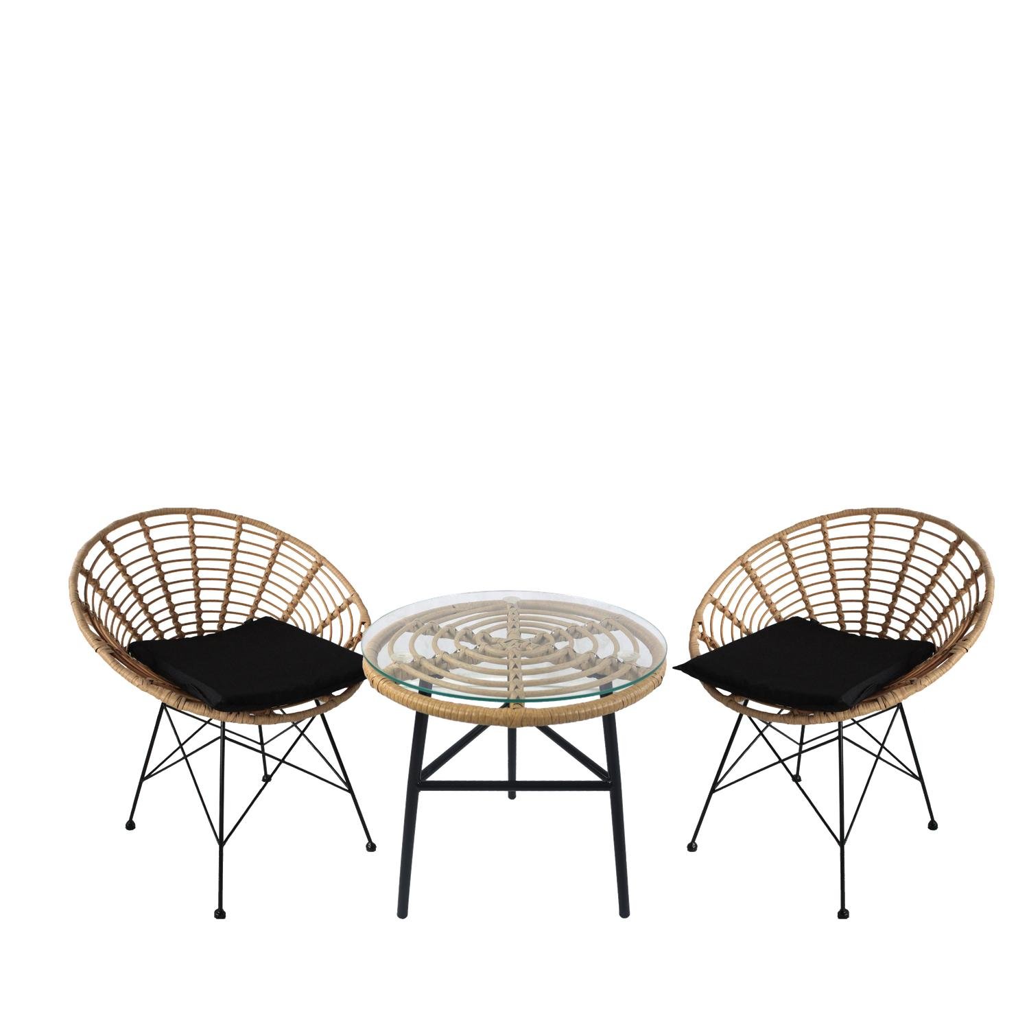 Σετ τραπεζαρία κήπου ARELLIUS φυσικό/μαύρο μέταλλο/rattan/γυαλί με 2 καρέκλες.
