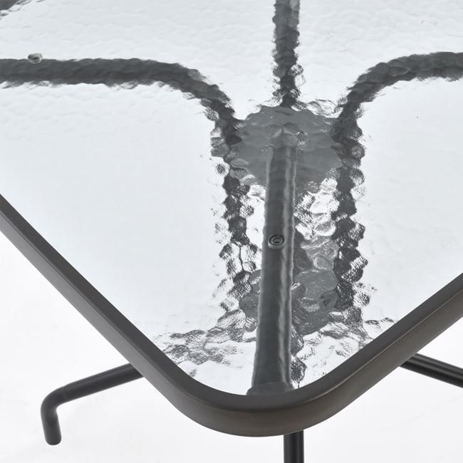 Ένα τραπέζι μεταλλικό εξωτερικού χώρου σε χρώμα γκρι-ανθρακί, με ενσωματωμένο τζαμί ασφάλειας (secure).