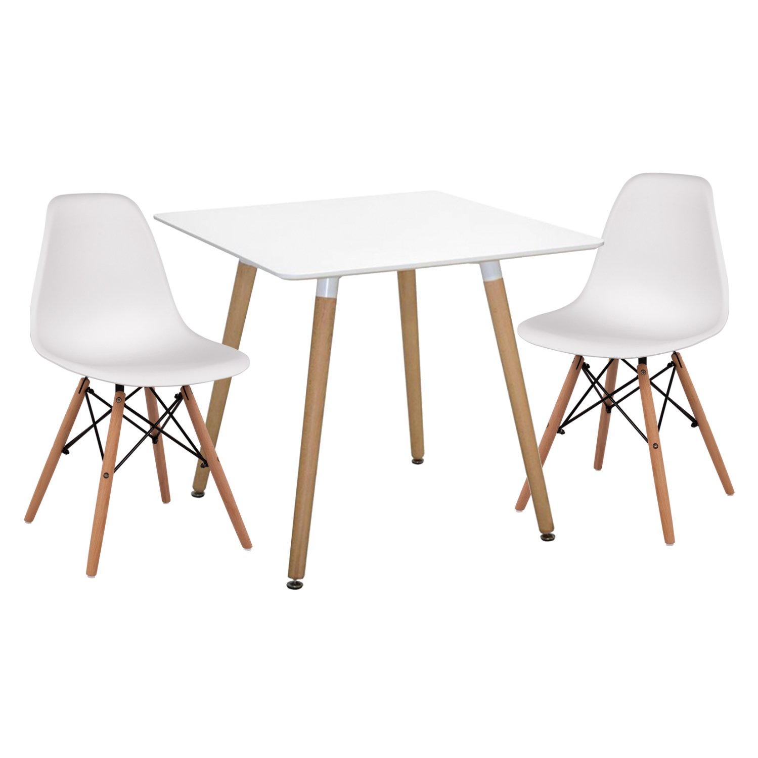 Ένα τετράγωνο τραπέζι με πόδια οξιάς σε ΦΥΣΙΚΟ χρώμα και MDF επιφάνεια σε ΛΕΥΚΟ χρώμα, και 2 καρέκλες με ενιαία πλάτη και κάθισμα από πολυπροπυλένιο σε ΛΕΥΚΟ χρώμα και πόδια οξιάς σε φυσικό χρώμα.