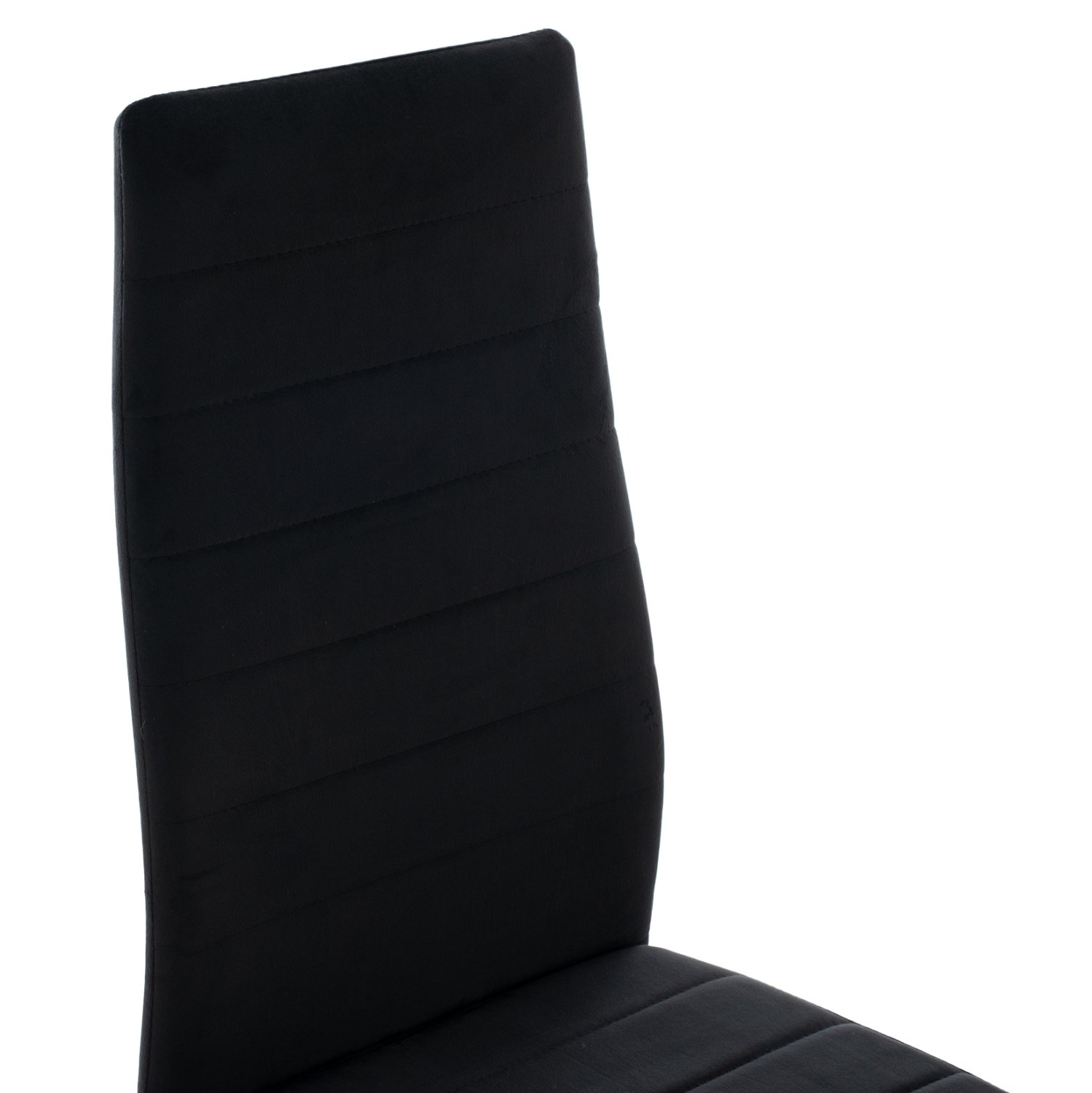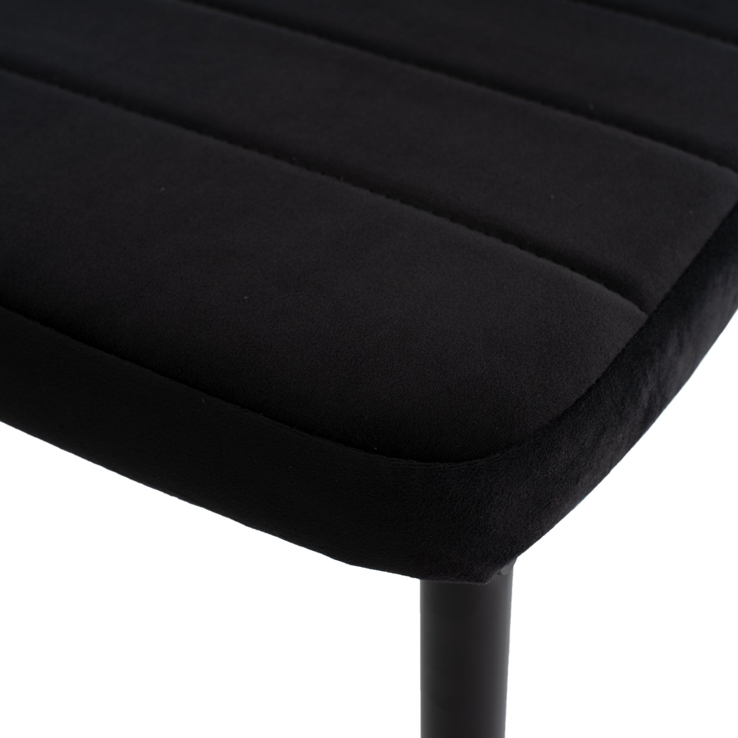Ένα ορθογώνιο τραπέζι με πόδια από ξύλο οξιάς σε ΦΥΣΙΚΟ χρώμα και επιφάνεια από MDF σε ΜΑΥΡΟ χρώμα, και 4 καρέκλες με επένδυση από βελούδο σε ΜΑΥΡΟ χρώμα και μεταλλικά πόδια επίσης σε ΜΑΥΡΟ χρώμα.