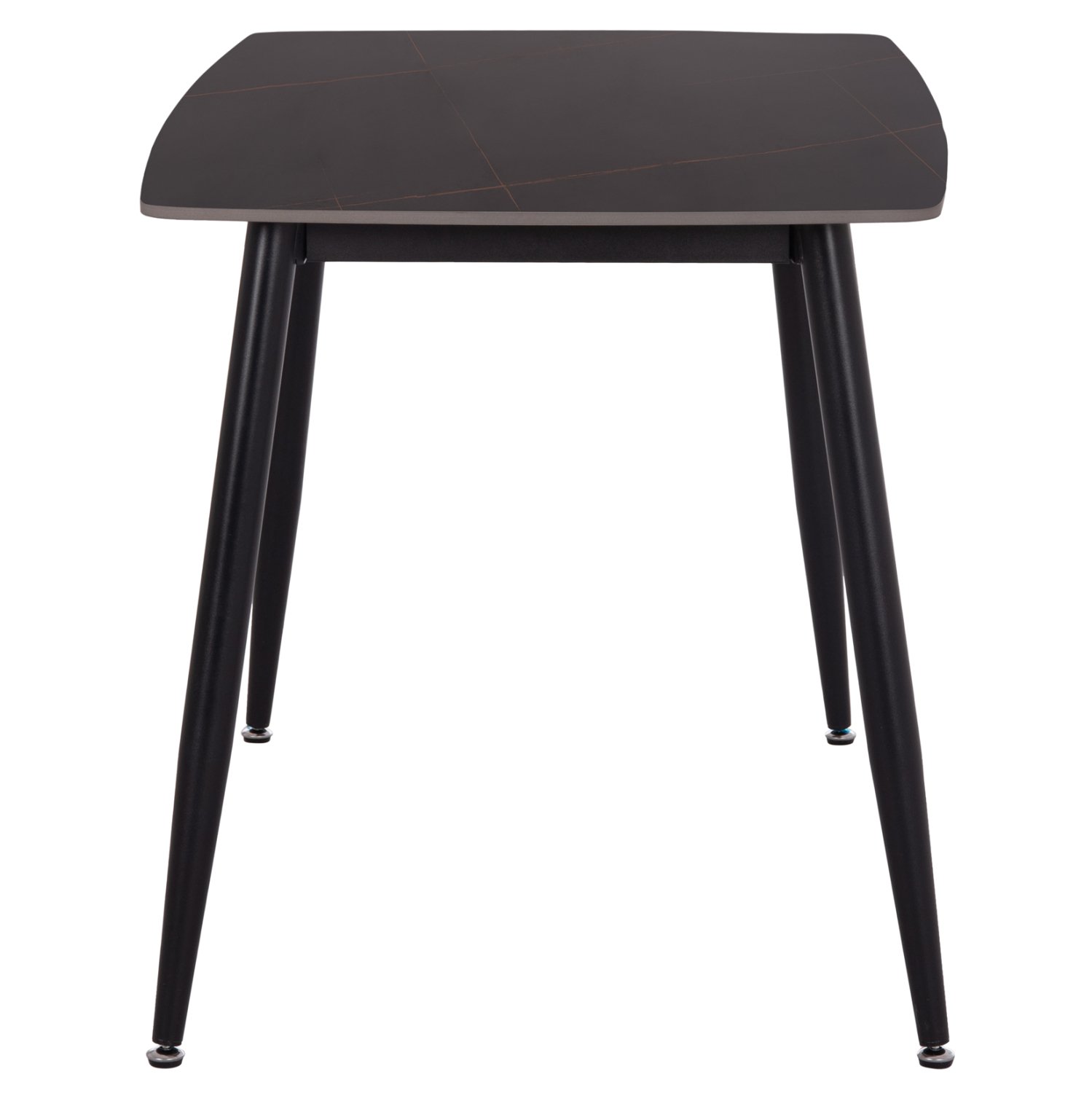 Ένα ορθογώνιο τραπέζι με σκελετό μεταλλικό σε ΜΑΥΡΟ χρώμα και κεραμική επιφάνεια με όψη ΜΑΥΡΟΥ ΜΑΡΜΑΡΟΥ, και 4 καρέκλες με ψηλή πλάτη και κάθισμα με επένδυση από βελούδινο ύφασμα σε χρώμα ΣΑΠΙΟ ΜΗΛΟ και μεταλλικό σκελετό σε ΜΑΥΡΟ χρώμα.