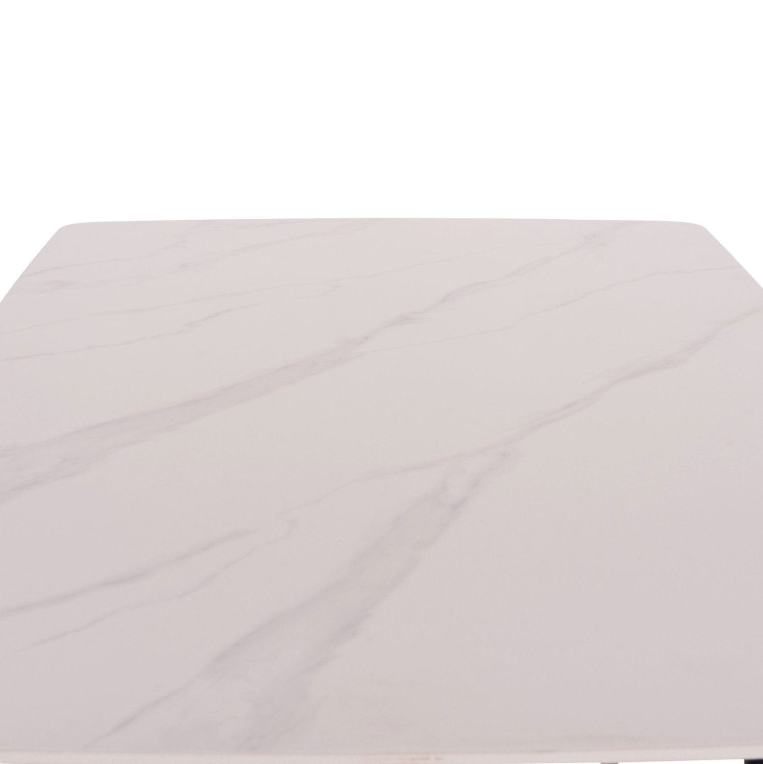 Ένα ορθογώνιο τραπέζι με σκελετό μεταλλικό σε ΜΑΥΡΟ χρώμα και κεραμική επιφάνεια με όψη ΛΕΥΚΟΥ ΜΑΡΜΑΡΟΥ, και 4 καρέκλες με ψηλή πλάτη και κάθισμα με επένδυση από συνθετικό δέρμα PU σε ΚΡΕΜ χρώμα και μεταλλικό σκελετό σε ΜΑΥΡΟ χρώμα.