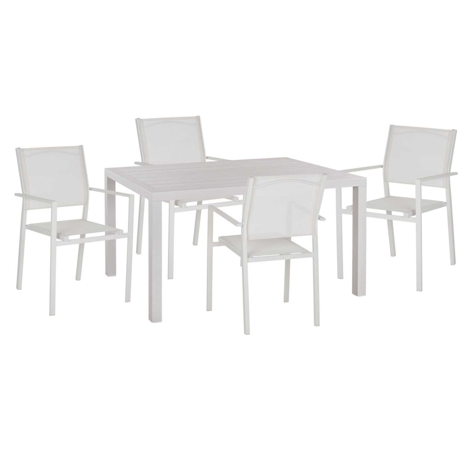 ΗΜ11828—Σετ εξωτερικού χώρου με ΛΕΥΚΟ αλουμινένιο τραπέζι και 4 μεταλλικές πολυθρόνες με textilene σε ΛΕΥΚΟ χρώμα.