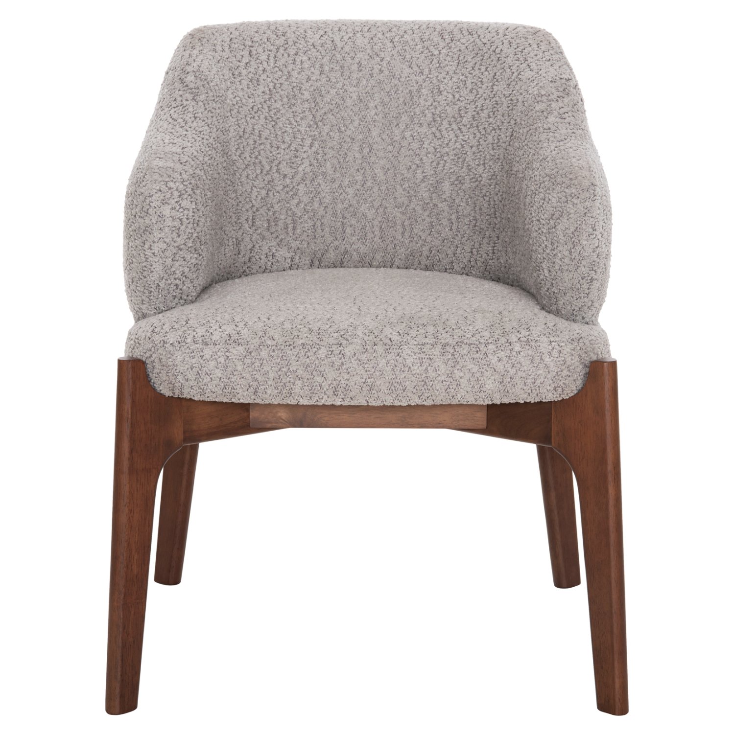 Ένα ορθογώνιο τραπέζι με στρογγυλεμένες γωνίες με ιδιαίτερο χαρακτηριστικό ότι η απόχρωση της φαλτσοκομμένης επιφάνειας αλλά και των ποδιών/βάσεων είναι ΣΚΟΥΡΑ ΚΑΡΥΔΙ σε sunburst τεχνοτροπία του καπλαμά, και 6 πολυθρόνες από ποιοτικό μασίφ rubberwood (καουτσουκόδεντρο) σε ΚΑΡΥΔΙ χρώμα με επένδυση από μπουκλέ ύφασμα σε ανοιχτό ΓΚΡΙ χρώμα.