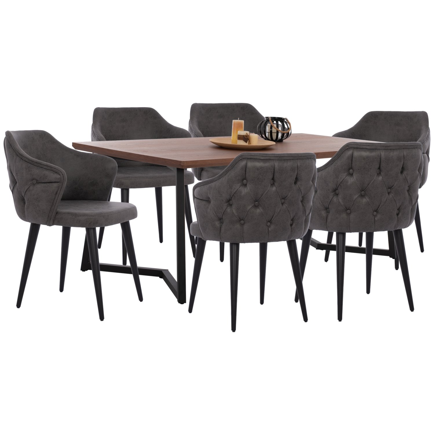 HM10635—Σετ τραπεζαρίας με τραπέζι και 6 πολυθρόνες. Το τραπέζι είναι μεγάλο, μοντέρνο κι επιβλητικό σε χρώμα καρυδί. Είναι κατασκευασμένο από «φαλτσοκομμένη» επιφάνεια MDF με καπλαμά από ξύλο καρυδιάς σε ρουστίκ στυλ και τα πόδια είναι μεταλλικά σε μοντέρνα διάταξη. Οι πολυθρόνες είναι επίσης σε μοντέρνα γραμμή με ξύλινα μαύρα πόδια και πανέμορφο design στο κάθισμα. Το χρώμα είναι γκρι ενώ το πίσω μέρος της πλάτης με τον καπιτονέ σχεδιασμό προσφέρει έναν ιδιαίτερο χαρακτήρα στην πολυθρόνα και επιβεβαιώνει την εντύπωση της πολυτέλειας που σου δίνει με την πρώτη κιόλας ματιά. Με το συγκεκριμένο σετ είναι σίγουρο ότι θα δημιουργήσετε την τραπεζαρία των ονείρων σας. Η ποιότητα των υλικών και το design είναι τέτοια που θα προκαλέσουν τον θαυμασμό όλων.