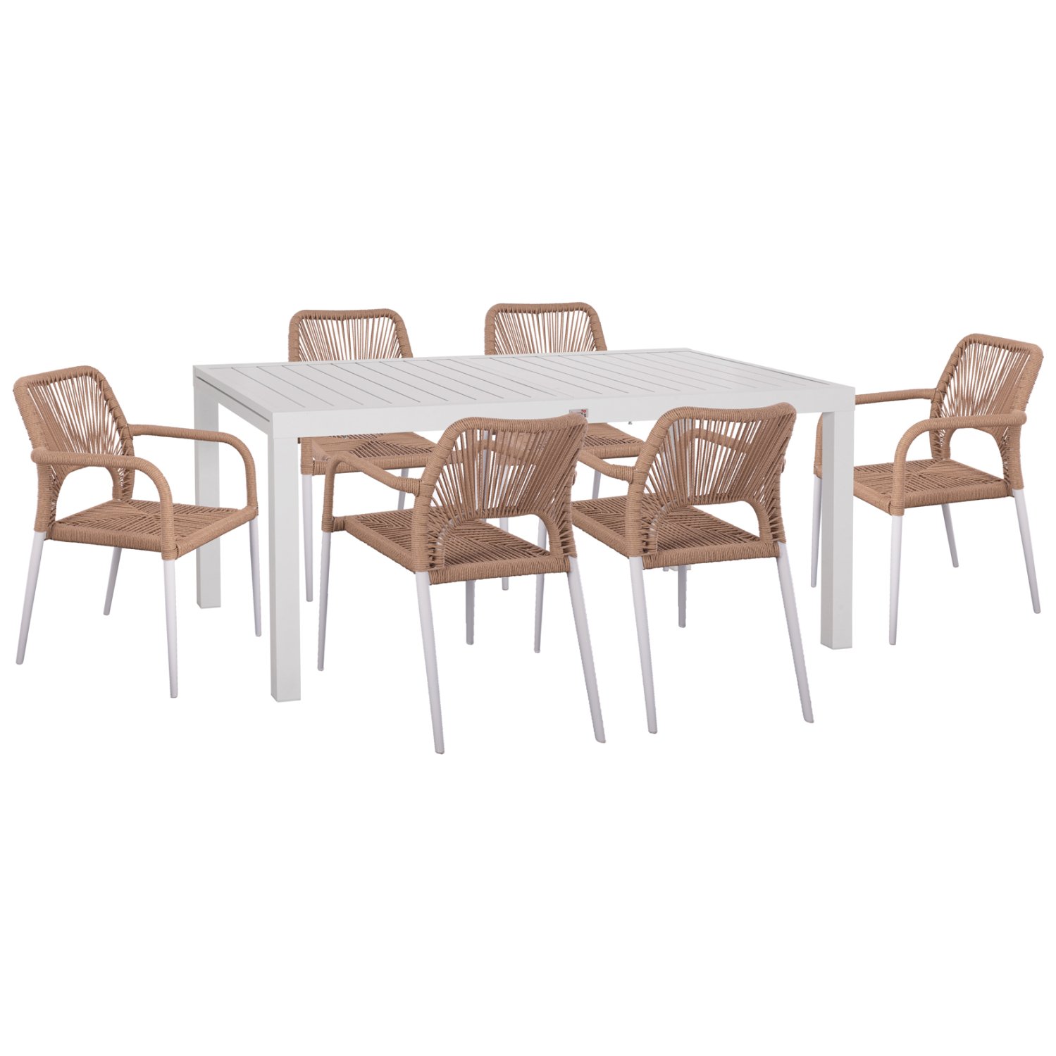 Αυτό το σετ τραπεζαρίας εξωτερικού χώρου αποτελείται από ένα ΛΕΥΚΟ επεκτεινόμενο τραπέζι αλουμινίου και 6 ΛΕΥΚΕΣ πολυθρόνες αλουμινίου με ΜΠΕΖ κάθισμα και επένδυση από συνθετικό Rattan.