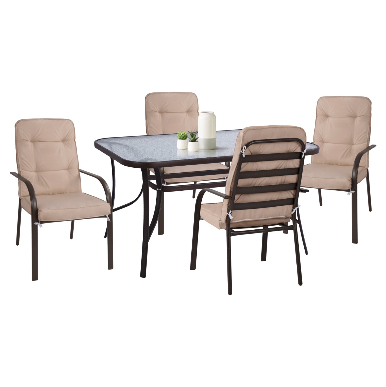 ΗΜ11880—Σετ εξωτερικού χώρου με τραπέζι με ΚΑΦΕ μεταλλικό σκελετό και γυάλινη θολή ΕΝΙΣΧΥΜΕΝΗ επιφάνεια και 4 μεταλλικές πολυθρόνες με ΚΑΦΕ σκελετό και αναπαυτικό μαξιλάρι σε ΜΠΕΖ χρώμα. Επίσης, είναι ΣΤΟΙΒΑΖΟΜΕΝΕΣ άρα και ιδιαιτέρως πρακτικές, αφού αποθηκεύονται εύκολα και στον μικρότερο δυνατό χώρο.