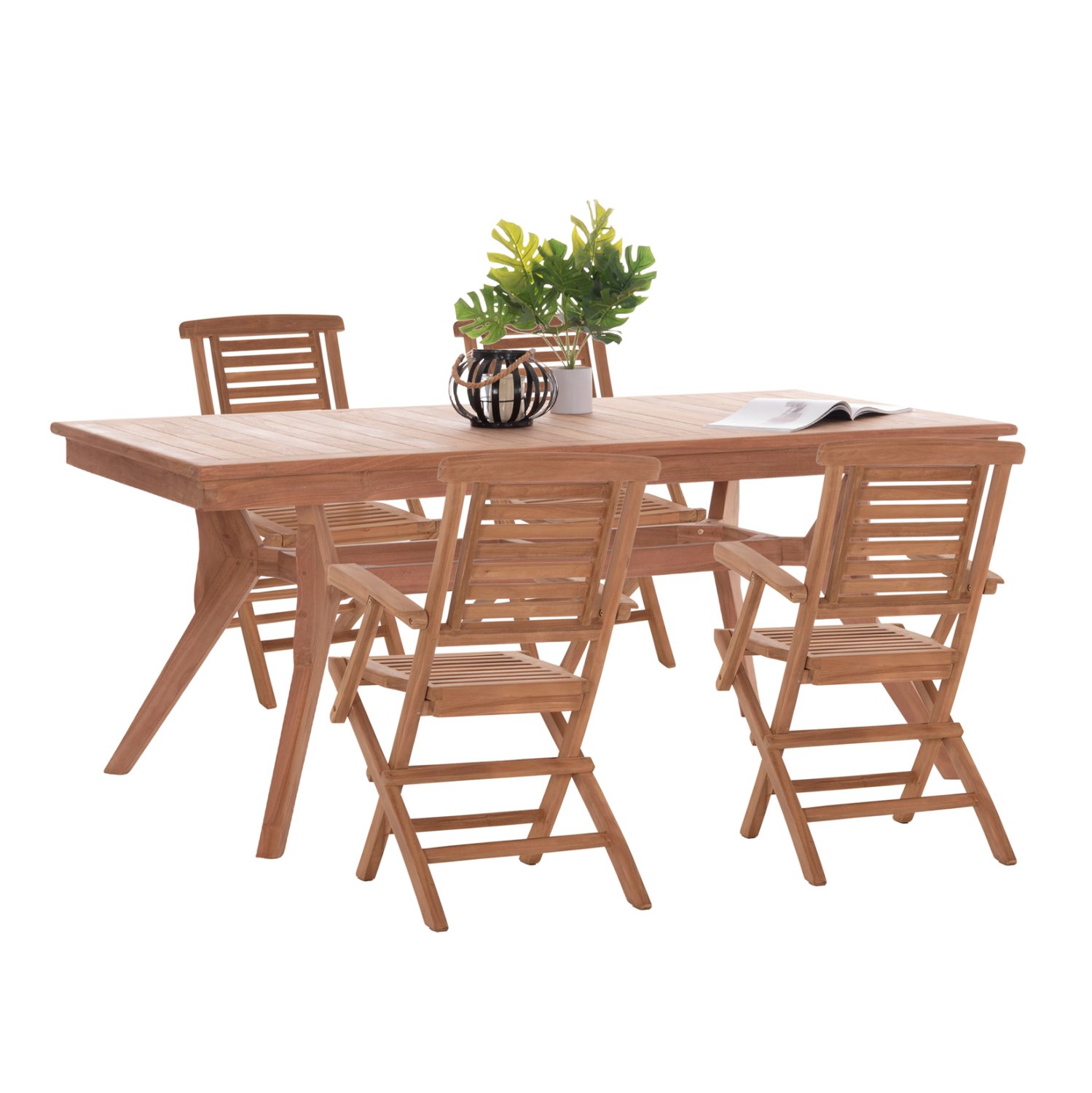 Αυτό το Σετ τραπεζαρίας εξωτερικού χώρου διαθέτει ορθογώνιο τραπέζι και 4 πτυσσόμενες πολυθρόνες, όλα κατασκευασμένα από ξύλο TEAK σε ΦΥΣΙΚΟ χρώμα.