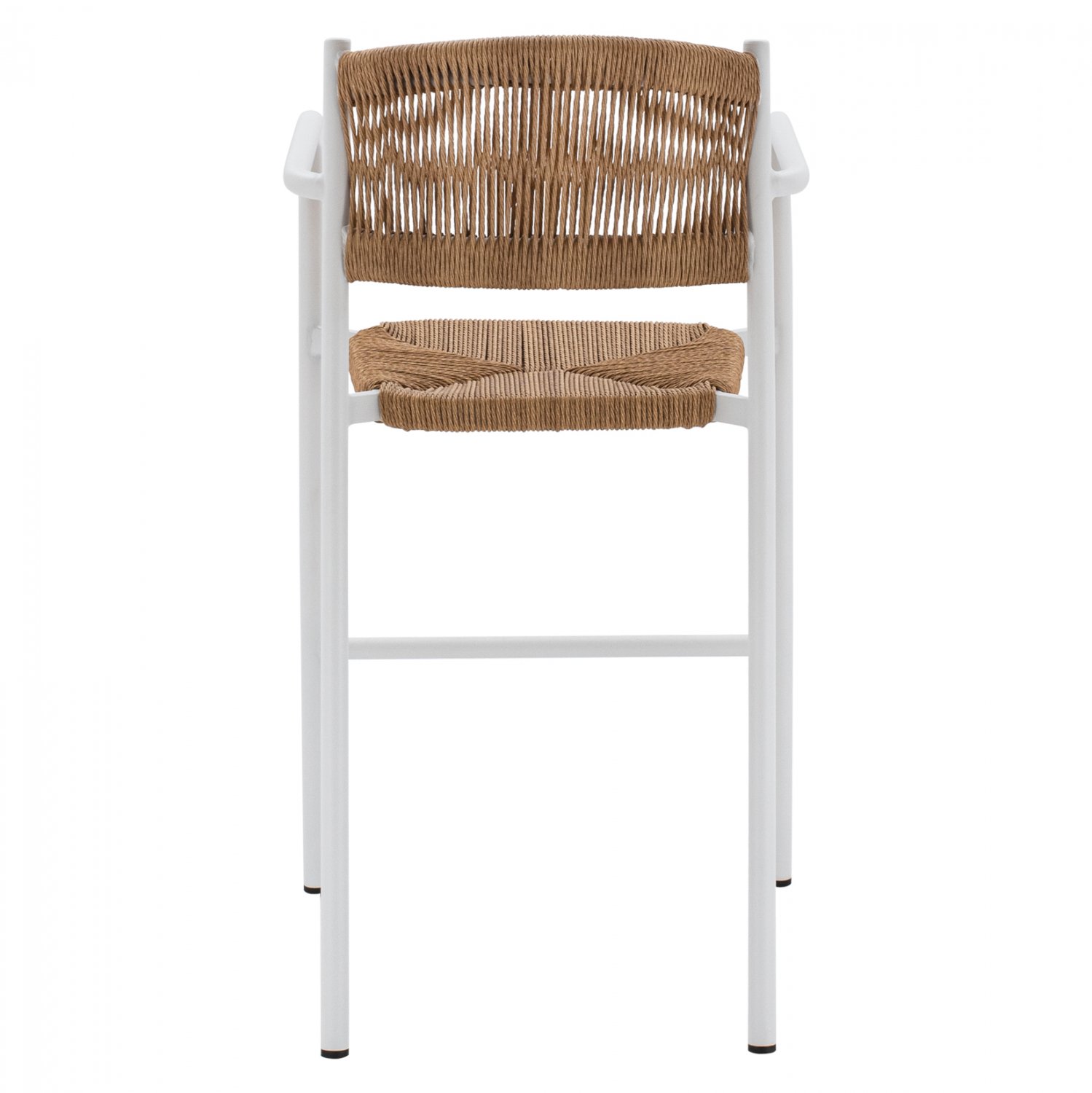 Μοντέρνο σκαμπό bar, κατασκευασμένo από σκελετό αλουμινίου σε λευκή απόχρωση, επενδυμένο με σχοινί στην πλάτη και στο κάθισμα σε μπεζ απόχρωση.