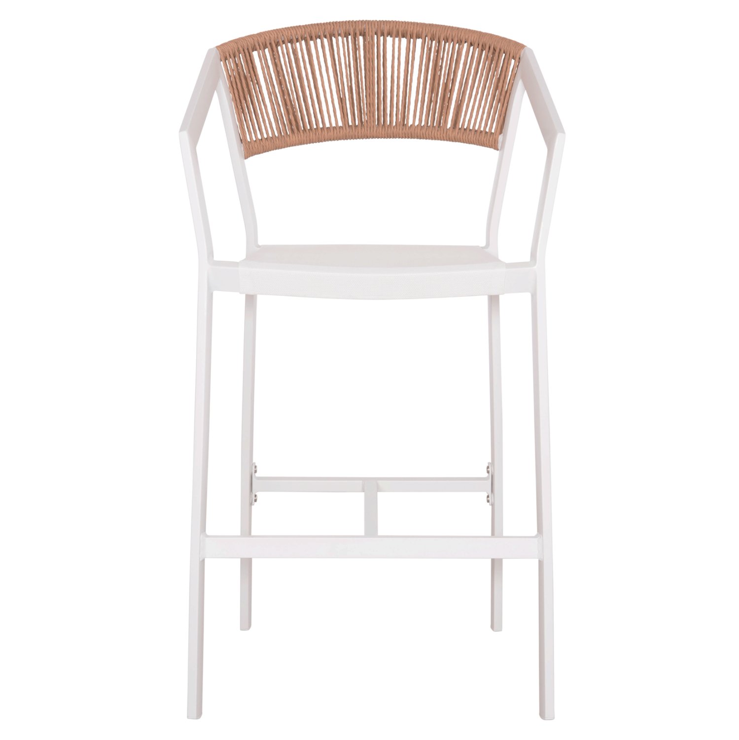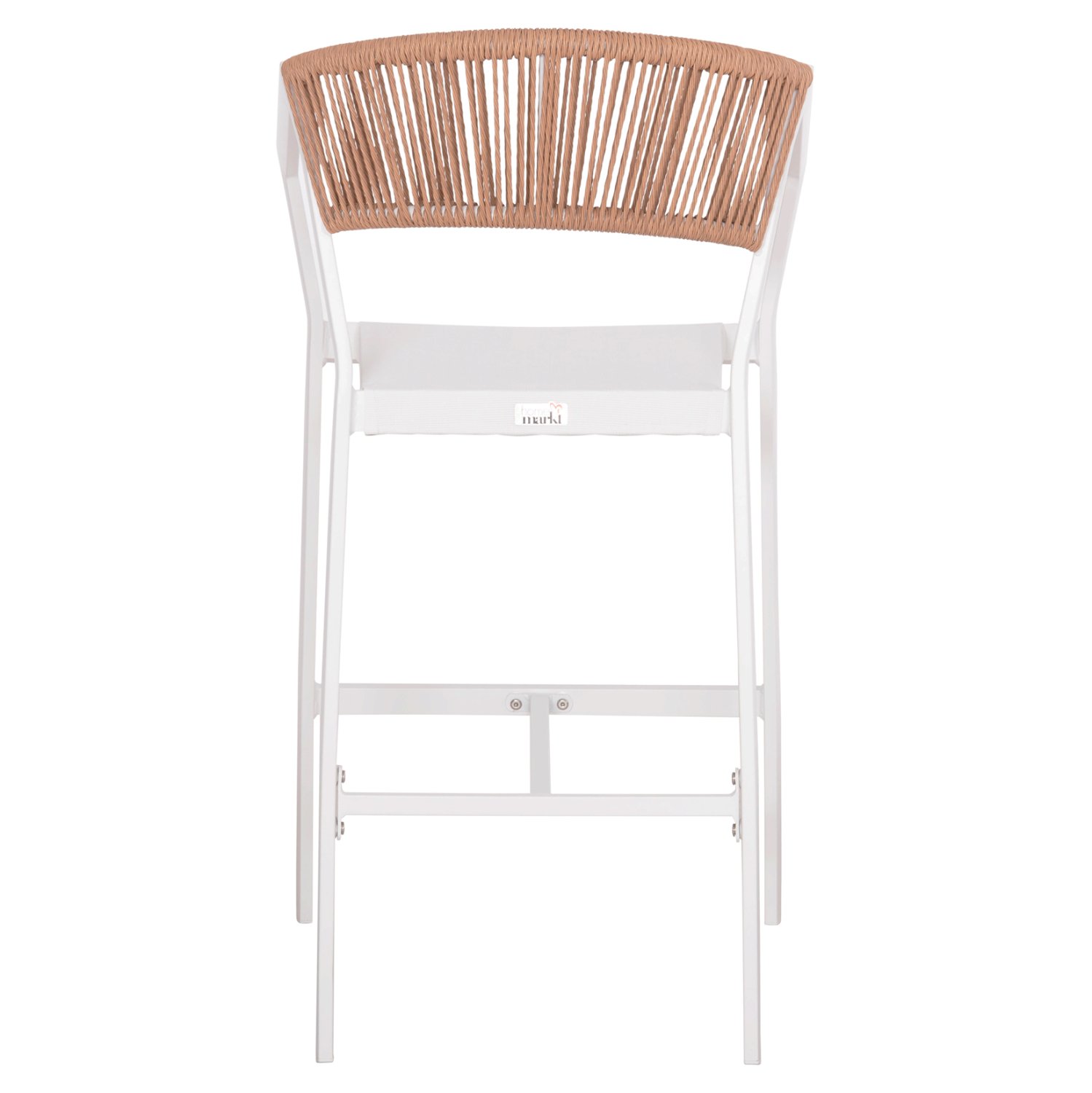 Η πλάτη του σκαμπό είναι επενδυμένη με πολυεστερικό RATTAN. Στα περισσότερα έπιπλα κήπου και γενικά σε έπιπλα για εξωτερικούς χώρους χρησιμοποιείται συνθετικό υλικό από PVC, δηλαδή τεχνητές ίνες υψηλής ποιότητας. Αυτό δίνει στην κατασκευή εξαιρετική αντοχή και ανθεκτικότητα σε ακραίες συνθήκες ζέστης ή κρύου.
