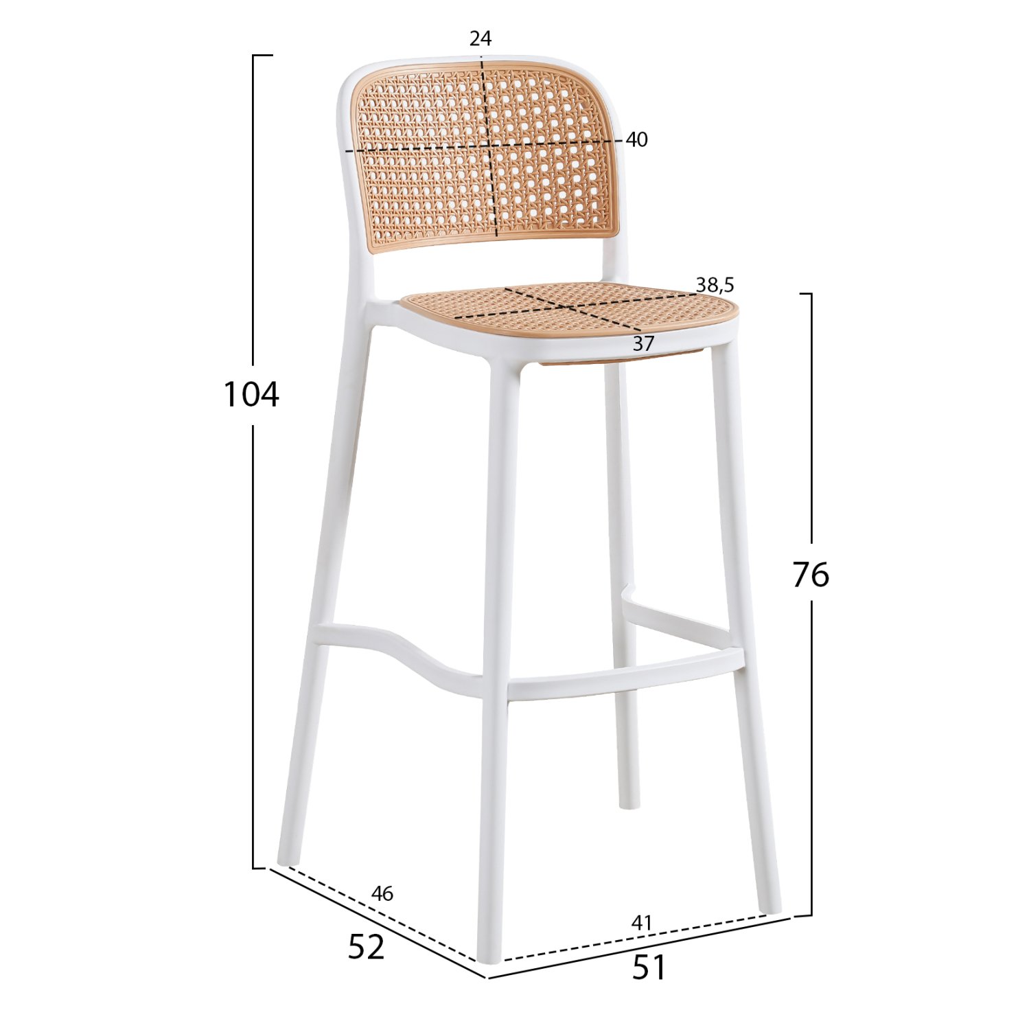 Όλο το σκαμπό είναι από μονοκόμματο πολυπροπυλένιο σε ΛΕΥΚΟ χρώμα με σχετικά χαμηλή πλάτη η οποία είναι σε στυλ “ψάθας” πολυπροπυλενίου, όπως και το κάθισμα, σε ΜΠΕΖ απόχρωση.