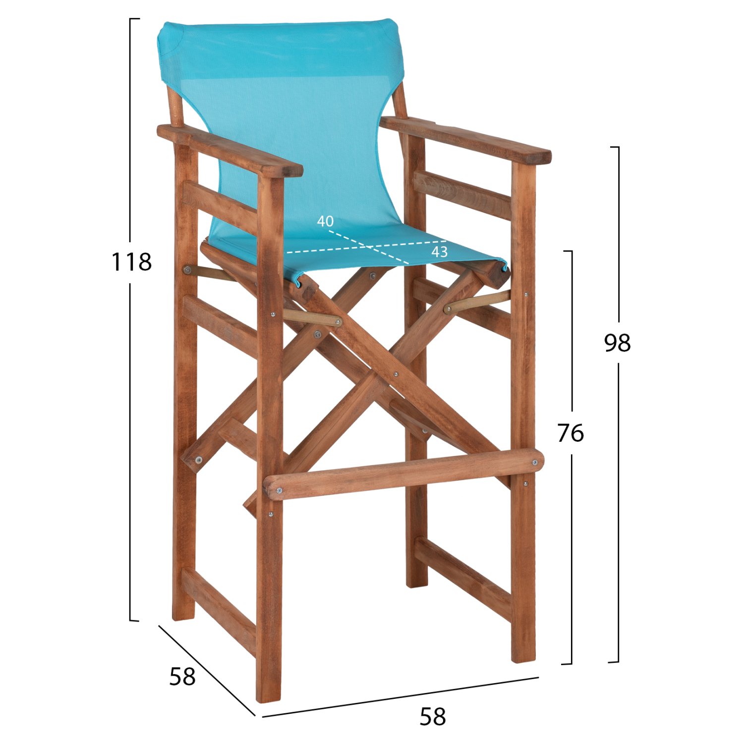 Το HM10374.08 είναι ένα σκαμπό-μπαρ με πλάτη που θα ενθουσιάσει. Στην πραγματικότητα είναι μια καρέκλα σκηνοθέτη σε ψηλή έκδοση. Δεν χρειάζεται ιδιαίτερη περιγραφή μιας και όλοι γνωρίζουν τι θα πει καρέκλα σκηνοθέτη. Είναι πτυσσόμενη και σταθερή και τo ΓΑΛΑΖΙΟ χρώμα του textilene στην πλάτη και το κάθισμα μπορεί πολύ εύκολα να συνδυαστεί με κάθε είδους διακοσμητικό μοτίβο που επιλέγετε για τον χώρο σας, είτε είναι η αυλή ή το μπαλκόνι του σπιτιού σας, είτε ο επαγγελματικός σας χώρος.