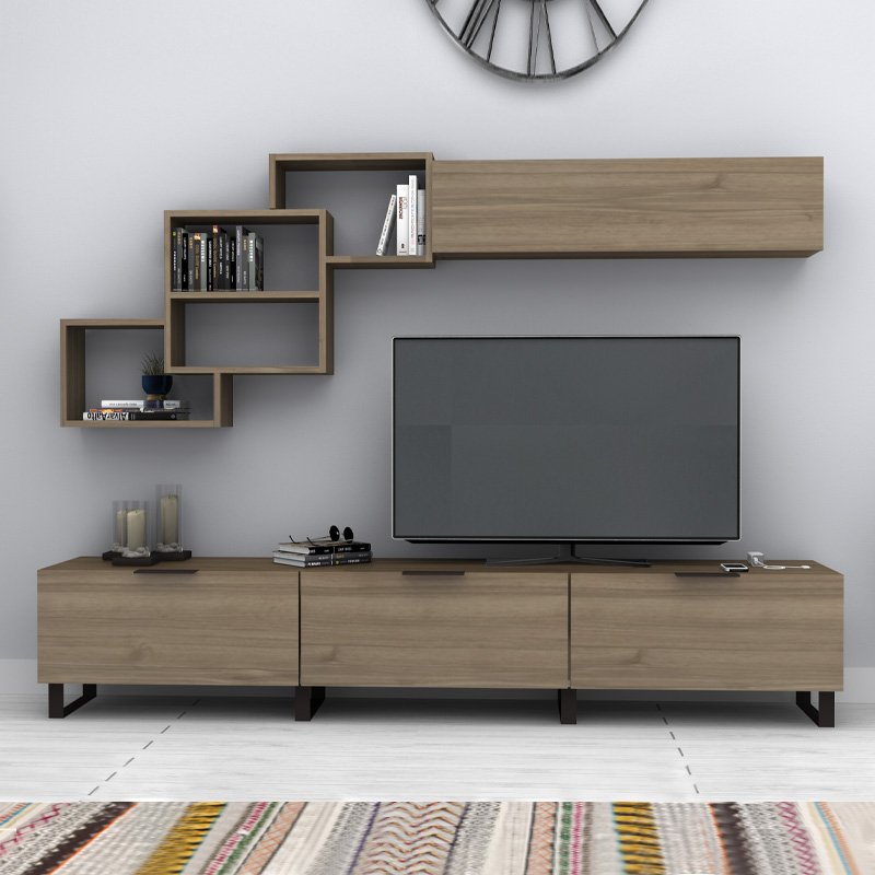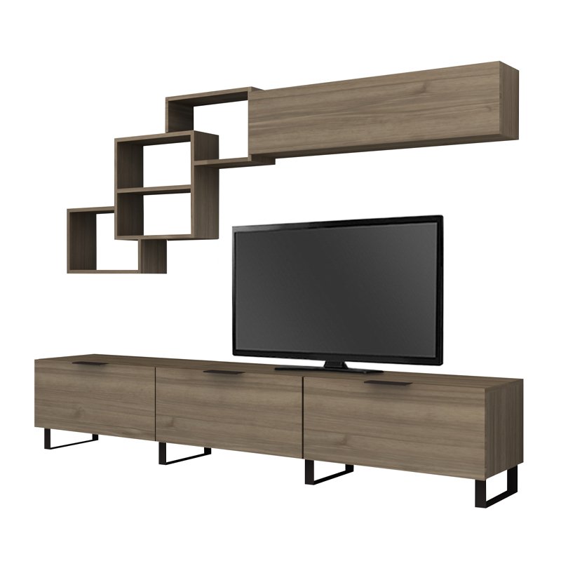 - Η σύνθεση αποτελείται από ένα έπιπλο τηλεόρασης, μία ραφιέρα τοίχου και ένα οριζόντιο μονόφυλλο ντουλάπι.