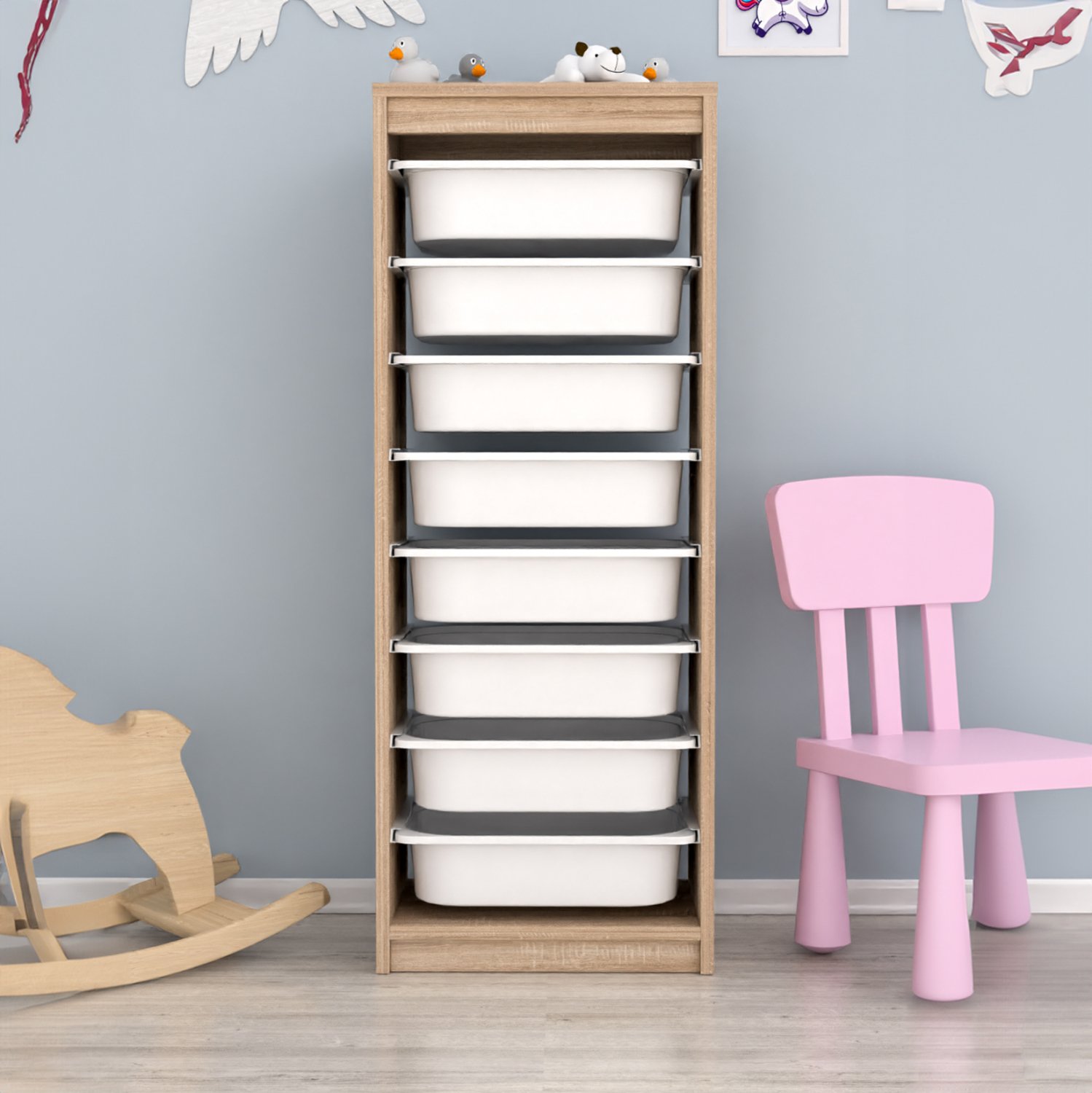 Η SANI είναι μια ψηλή συρταριέρα με πλαίσιο από μελαμίνη σε χρώμα SONAMA, με 8 ΛΕΥΚΑ συρτάρια από πολυαιθυλένιο (πλαστικό). Ιδανική συρταριέρα για την καλύτερη οργάνωση του παιδικού δωματίου.