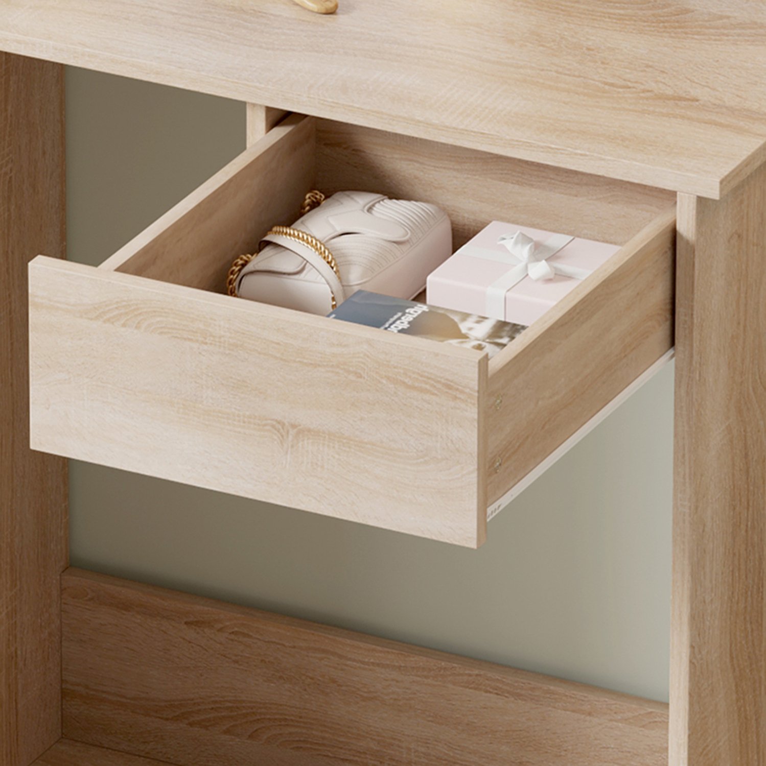 Η νέα τουαλέτα LAURYN είναι ένα πρακτικότατο έπιπλο σε χρώμα SONAMA που θα αλλάξει την εικόνα του χώρου σας. Αποτελείται από ένα τραπέζι με καθρέπτη και 1 συρτάρι κάτω από την επιφάνεια. Αυτό όμως που κερδίζει τις εντυπώσεις είναι ότι ο καθρέπτης συνοδεύεται από φώτα LED περιμετρικά, καθώς και από 2 ραφάκια που δημιουργούν 3 χώρους τοποθέτησης αντικειμένων στην δεξιά πλευρά, απογειώνοντας την χρησιμότητα του επίπλου.