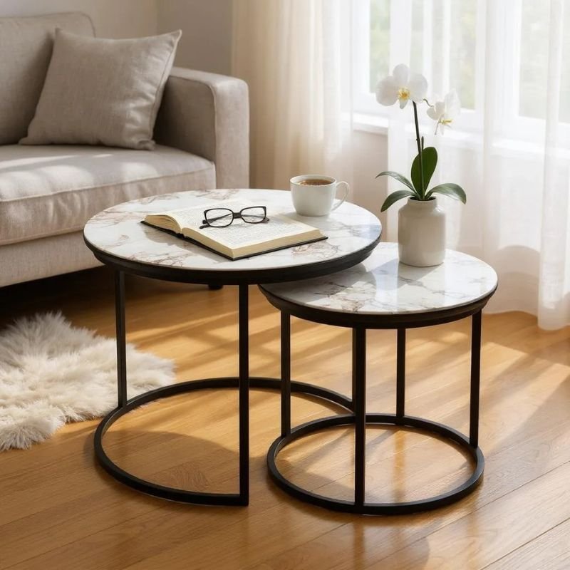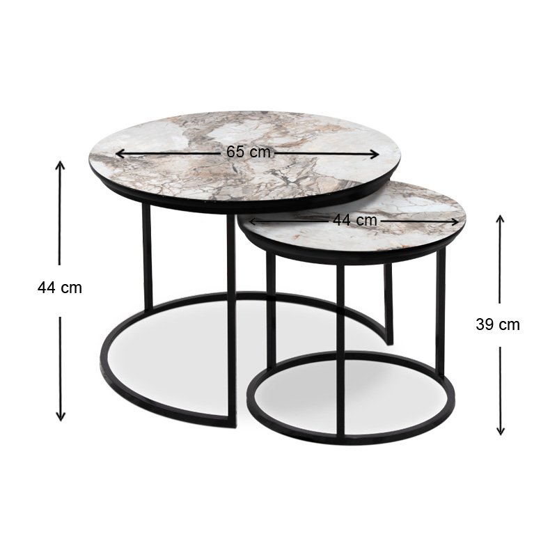 - Το σετ περιλαμβάνει δύο στρογγυλά τραπεζάκια, ένα μικρότερο κι ένα μεγαλύτερο.