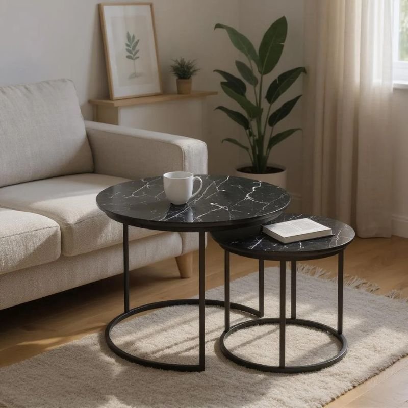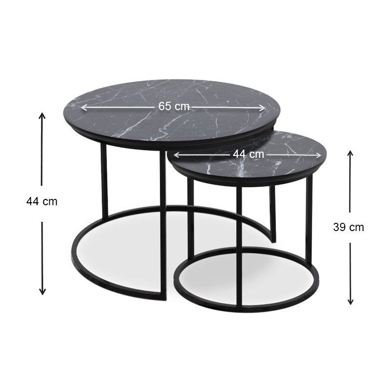 - Το σετ περιλαμβάνει δύο στρογγυλά τραπεζάκια, ένα μικρότερο κι ένα μεγαλύτερο.