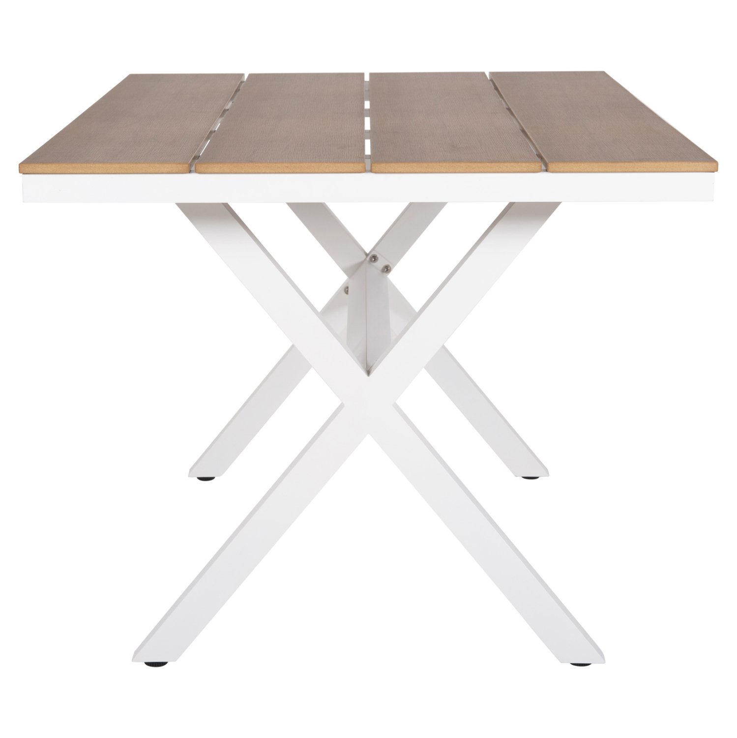 Το TAWNEE είναι ένα ορθογώνιο τραπέζι για εξωτερικούς χώρους με σκελετό αλουμινίου σε χιαστί διάταξη ποδιών που συνδέονται με μια μπάρα αλουμινίου και έχει ΛΕΥΚΟ χρώμα. Η επιφάνεια είναι από πλάκες polywood σε ΦΥΣΙΚΟ χρώμα ξύλου. Πρόκειται για ένα όμορφο τραπέζι σε μεγάλη διάσταση, που μπορεί να εξυπηρετήσει 6 τουλάχιστον άτομα.