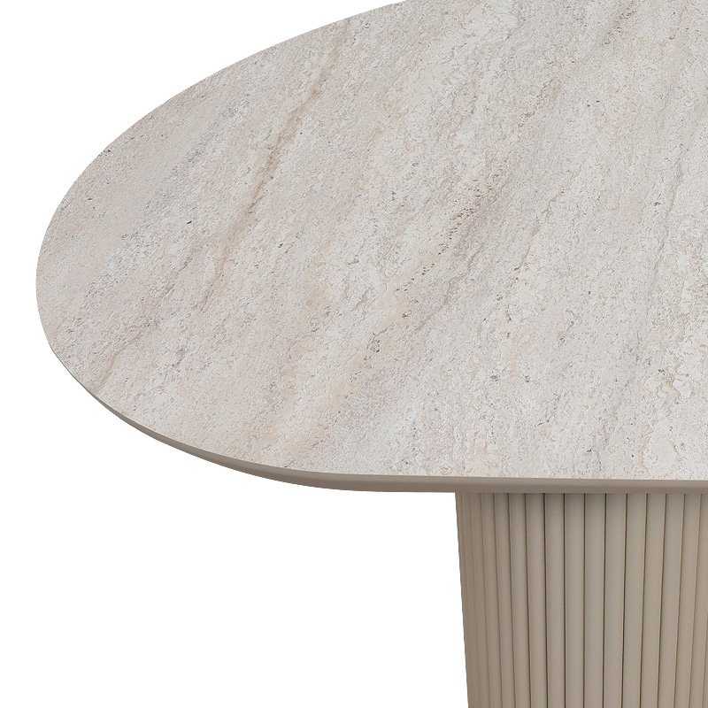 Αν αγαπάτε τη ζεστασιά και την αρμονία του σκανδιναβικού design, το τραπέζι Hazar θα γίνει το επίκεντρο του χώρου σας. Η επιφάνεια, σε εντυπωσιακή υφή και απόχρωση travertine, χαρίζει φυσική κομψότητα και διακριτική πολυτέλεια. Το στοιχείο που το κάνει να ξεχωρίζει είναι τα ιδιαίτερα κυλινδρικά πόδια με τις κάθετες αυλακώσεις, που προσθέτουν αρχιτεκτονικό χαρακτήρα και σταθερότητα, ενώ παράλληλα δίνουν μια σύγχρονη και εκλεπτυσμένη αισθητική. Ένα έπιπλο που συνδυάζει λειτουργικότητα και υψηλή αισθητική, δημιουργώντας μια ατμόσφαιρα φινετσάτης απλότητας στον χώρο σας.