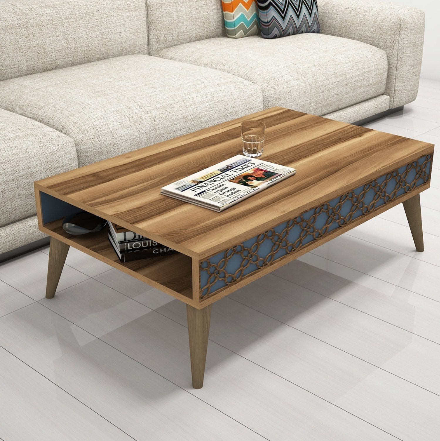 ΗΜ9499.02 τραπεζάκι σαλονιού—– Το τραπεζάκι αυτό είναι ένα όμορφο έπιπλο σε χρώμα καρυδί. Το πρακτικό του design θα αλλάξει την εικόνα του σαλονιού ή του καθιστικού σας προς το καλύτερο. Πρόκειται για μια κατασκευή με μια ικανοποιητικού μεγέθους επάνω επιφάνεια. Από κάτω υπάρχει ανοιχτός αποθηκευτικός χώρος σαν δεύτερη επιφάνεια. Το χαρακτηριστικό, όμως, σε αυτό το τραπεζάκι είναι ότι στα πλαϊνά υπάρχει σκαλιστό σχέδιο με μηχανικά μέσα (CNC Relief) σε ανοιχτό γαλάζιο (χαλκηδόνιο) χρώμα. Η κομψότητα, η ποιότητα και το minimal πρακτικό design χαρακτηρίζουν αυτό το τραπεζάκι, που έχει φτιαχτεί για εσένα.
