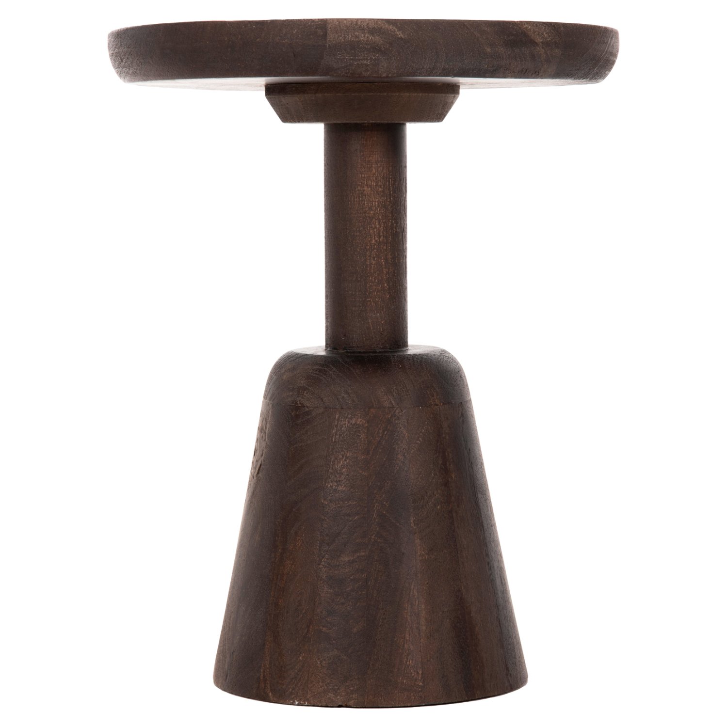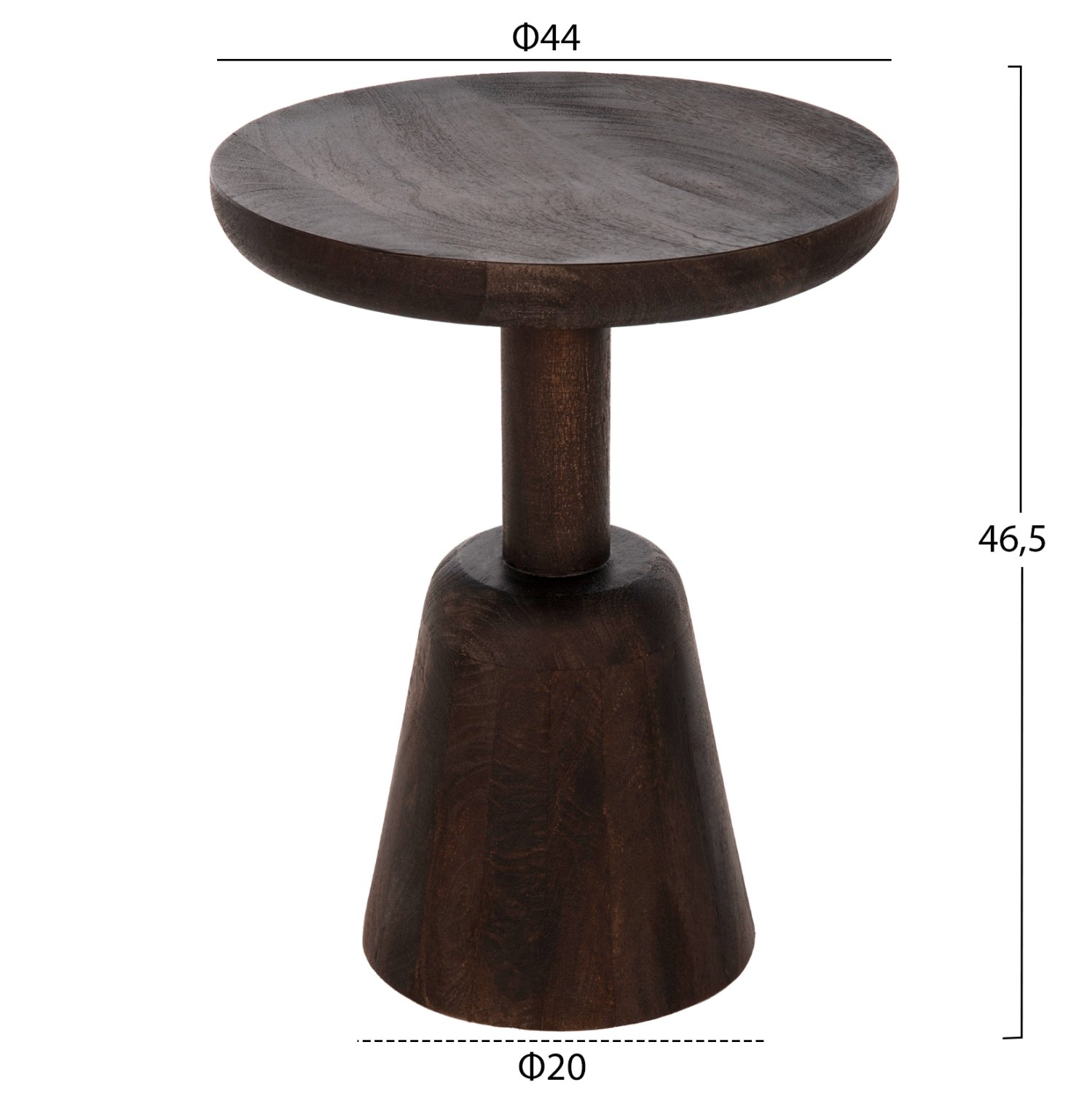 Το στρογγυλό τραπέζι σαλονιού CRABB που είναι εξολοκλήρου κατασκευασμένο από μασίφ ξύλο mango σε ΣΚΟΥΡΟ ΚΑΦΕ χρώμα μοιάζει με σκαμπό, χάρη στο κωνικό σχήμα της βάσης που καταλήγει στην στρογγυλή επιφάνεια. Ένα τραπέζι που θα εντυπωσιάσει με το σχήμα και το χρώμα του, αφού είναι sand blasted, προσδίδοντας εικόνα παλαιότητας στο έπιπλο.
