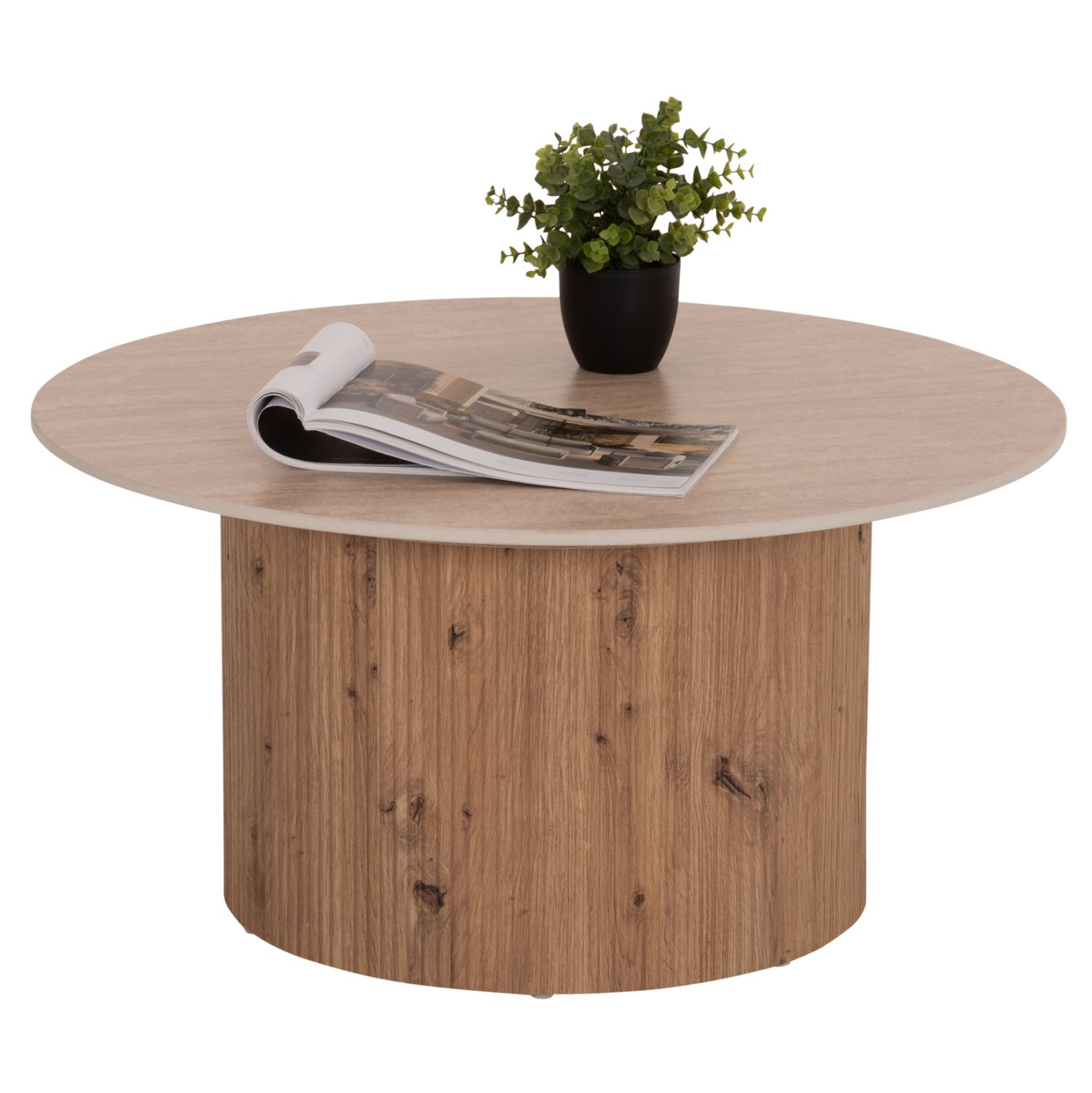 Το τραπέζι σαλονιού TWIL είναι στρογγυλό και αποτελεί νέα προσθήκη στην γκάμα μας. Η επίπεδη επιφάνειά του είναι κεραμική σε χρωματισμό TRAVERTINE STONE, ενώ η βάση του είναι κυλινδρική κατασκευασμένη εξολοκλήρου από MDF σε χρώμα ΦΥΣΙΚΟΥ ΞΥΛΟΥ, με όμορφες πτυχώσεις.