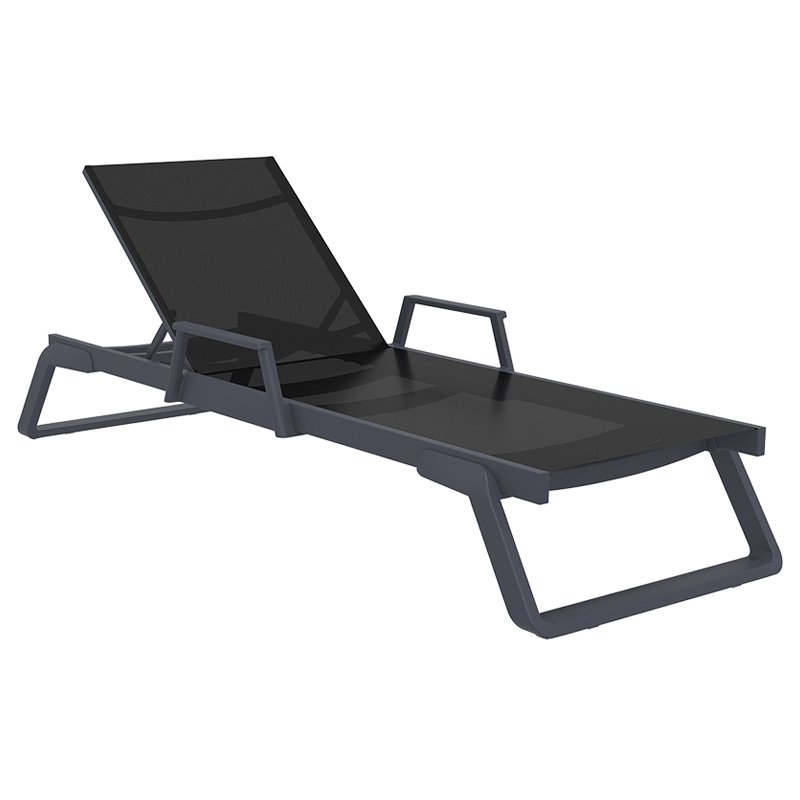 Tropic ξαπλώστρα με μπράτσα του οίκου Siesta σε χρώμα dark grey/black από υψηλής ποιότητας αλουμίνιο & πολυπροπυλένιο με ενίσχυση από υαλώδεις ίνες (fiber glass) για απόλυτη αντοχή και polyester fabric Serge Ferrari.Είναι στοιβαζόμενη,έχει ρυθμιζόμενη πλάτη 5 θέσεων,μικρά ροδάκια στo πίσω μέρος για εύκολη μετακίνηση και αντιολισθητικά πέλματα εμπρός.Πιστοποιημένο προιόν από τον Ιταλικό οίκο CATAS.
