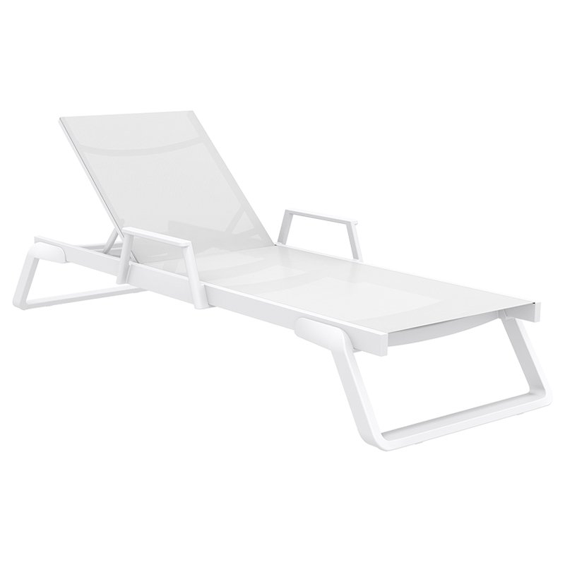 Tropic ξαπλώστρα με μπράτσα του οίκου Siesta σε χρώμα white/white από υψηλής ποιότητας αλουμίνιο & πολυπροπυλένιο με ενίσχυση από υαλώδεις ίνες (fiber glass) για απόλυτη αντοχή και polyester fabric Serge Ferrari.Είναι στοιβαζόμενη,έχει ρυθμιζόμενη πλάτη 5 θέσεων,μικρά ροδάκια στo πίσω μέρος για εύκολη μετακίνηση και αντιολισθητικά πέλματα εμπρός.Πιστοποιημένο προιόν από τον Ιταλικό οίκο CATAS.
