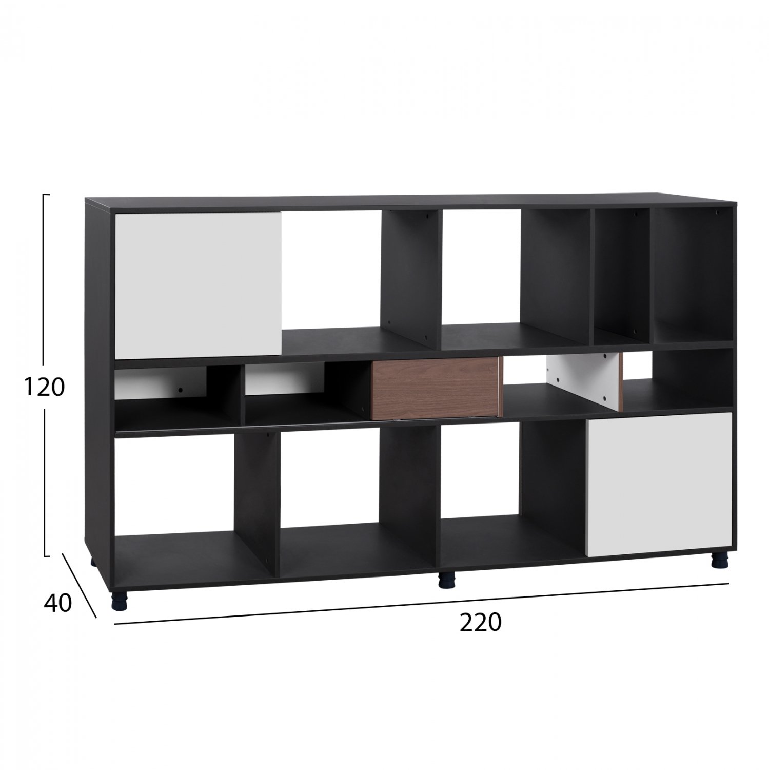 Διαθέτει δύο ντουλάπια, ένα συρόμενο πορτάκι για τρία διαδοχικά ράφια και εννέα ανοιχτούς αποθηκευτικούς χώρους.