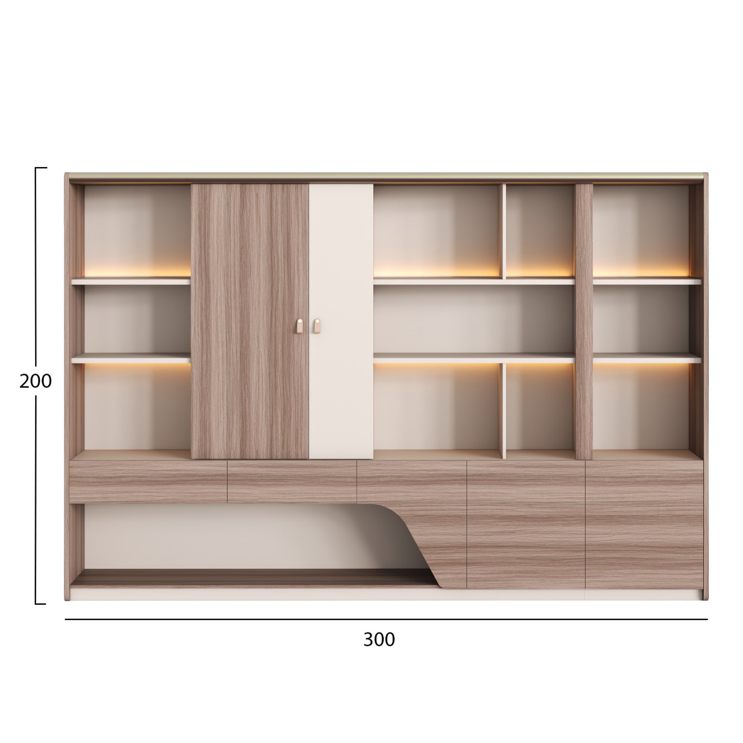Διαθέτει ενσωματωμένο φωτισμό LED, ο οποίος αναδεικνύει τόσο τα ανοιχτά ράφια όσο και το συνολικό design, δημιουργώντας ένα premium αποτέλεσμα. Το κάτω μέρος αποτελείται τόσο από ντουλάπια και συρτάρια, ιδανικά για αποθήκευση αρχείων και αντικειμένων που δεν χρειάζεται να είναι ορατά, όσο και από ανοιχτό χώρο αποθήκευσης. Στο επάνω κεντρικό τμήμα υπάρχουν ντουλάπια με ράφια, ενώ οι ανοιχτοί αποθηκευτικοί χώροι διαθέτουν έτοιμη εγκατάσταση LED φωτισμού.