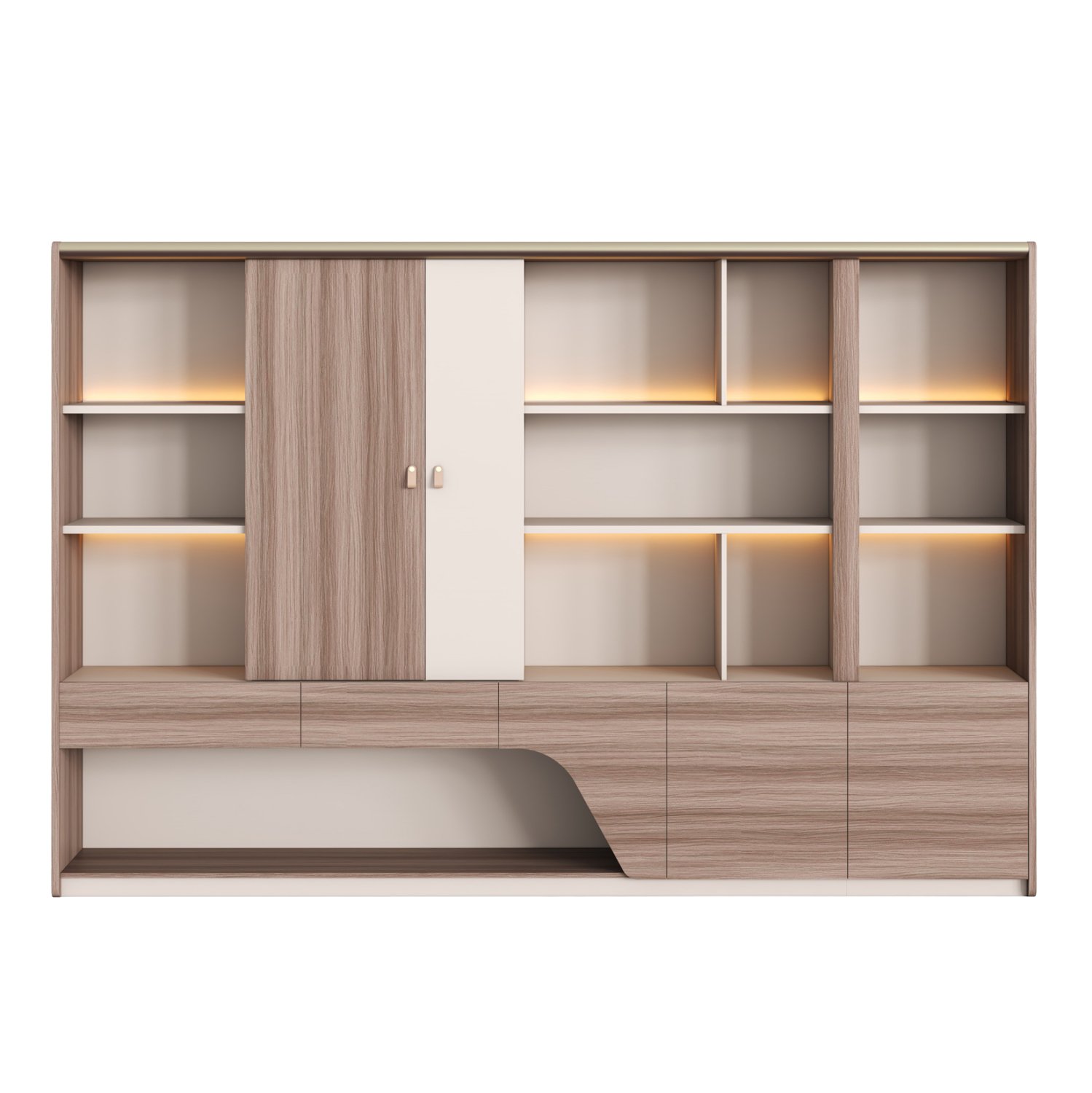 Η μεγάλη βιβλιοθήκη γραφείου SUPERON αποτελεί μια ολοκληρωμένη και κομψή λύση αποθήκευσης για σύγχρονους επαγγελματικούς χώρους. Ο σχεδιασμός της βασίζεται σε διχρωμία φυσικού ξύλου και μπεζ μελαμίνης, προσφέροντας ισορροπία ανάμεσα στη ζεστασιά και τη μοντέρνα αισθητική.