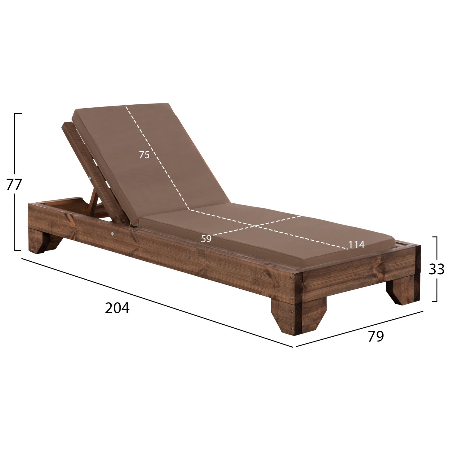 -Ολόκληρη η ξαπλώστρα έχει κατασκευαστεί από ξύλο πεύκου με εμποτισμό και επιπλέον στρώση με βερνίκι νερού. Το πεύκο είναι ένα μαλακό, λευκό ή ανοιχτό κίτρινο ξύλο το οποίο είναι ελαφρύ σε βάρος με ευθύγραμμα νερά ξύλου. Αντέχει στη συρρίκνωση, διόγκωση και κάμψη. Ο εμποτισμός υπό την ευρεία έννοια είναι ο χρωματισμός του ξύλου (συνήθως βερνίκια) με την μέθοδο της εμβάπτισης.