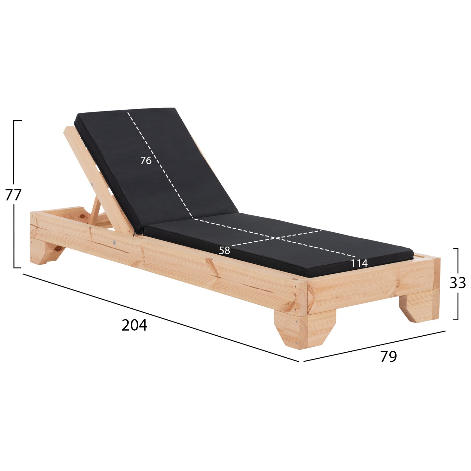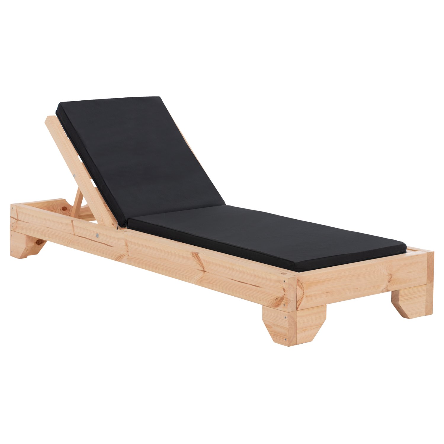 -Ολόκληρη η ξαπλώστρα έχει κατασκευαστεί από ξύλο πεύκου με εμποτισμό και επιπλέον στρώση με βερνίκι νερού. Το πεύκο είναι ένα μαλακό, λευκό ή ανοιχτό κίτρινο ξύλο το οποίο είναι ελαφρύ σε βάρος με ευθύγραμμα νερά ξύλου. Αντέχει στη συρρίκνωση, διόγκωση και κάμψη. Ο εμποτισμός υπό την ευρεία έννοια είναι ο χρωματισμός του ξύλου (συνήθως βερνίκια) με την μέθοδο της εμβάπτισης.
